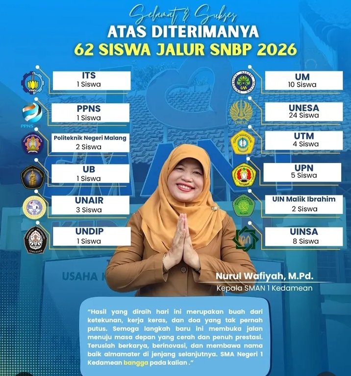 Pagi itu, kabar baik menyebar cepat di lingkungan SMA Negeri 1 Kedamean. Sebanyak 62 siswa dinyatakan lolos Seleksi Nasional Berdasarkan Prestasi (SNBP) 2026, sebuah capaian yang tidak datang secara tiba-tiba, melainkan melalui proses panjang yang terukur.