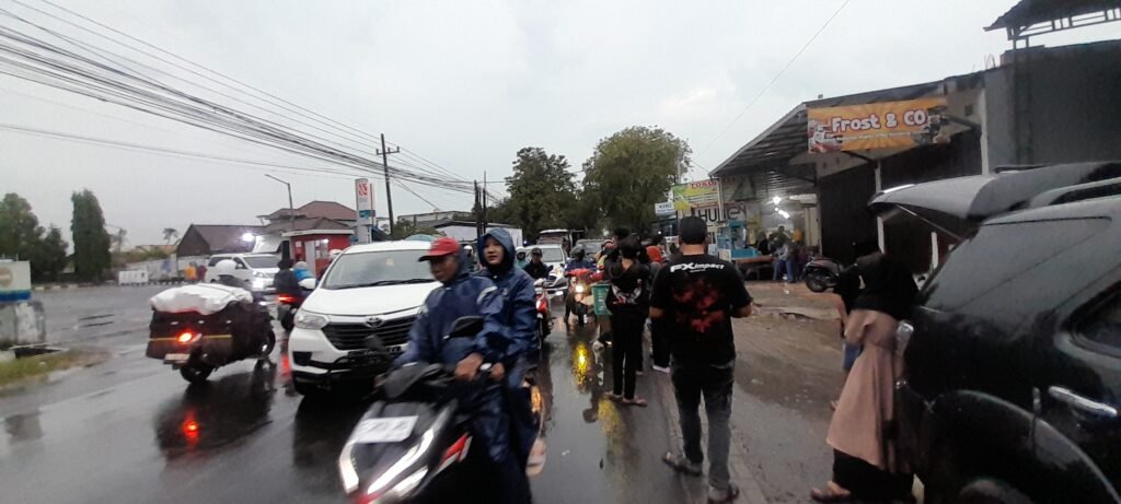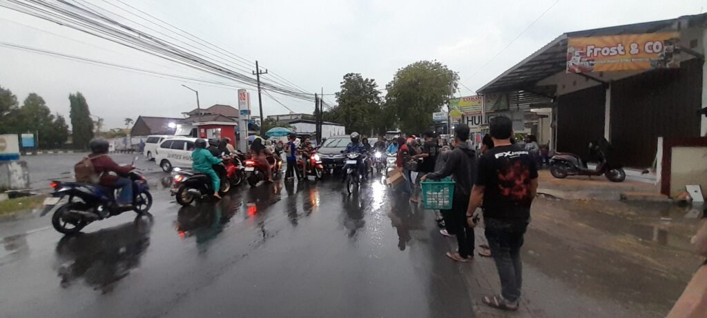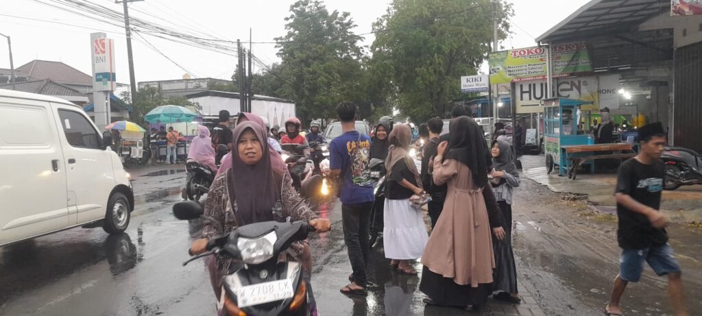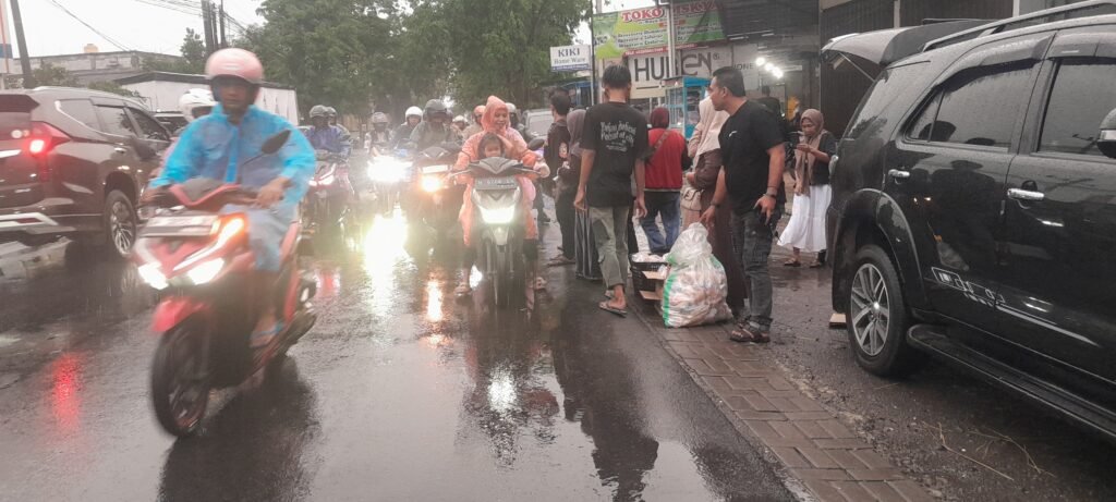 Di bawah langit mendung dengan aspal yang basah diguyur hujan, deretan sepeda motor dan mobil melambat. Lampu kendaraan memantul di genangan air, sementara beberapa pengendara tetap mengenakan jas hujan. Di tepi jalan, aktivitas berbagi berlangsung takjil diserahkan cepat, berpacu dengan waktu maghrib yang kian dekat.