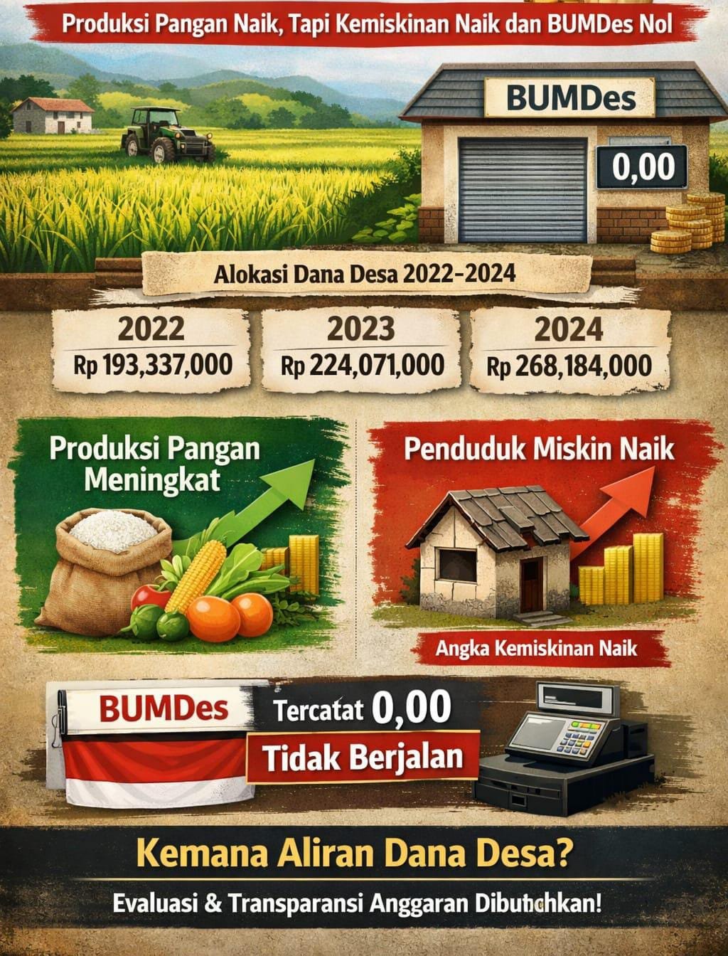 Dana Desa Rp685 Juta Pengalangan: Produksi Pangan Naik, Tapi Kemiskinan Naik dan BUMDes Nol