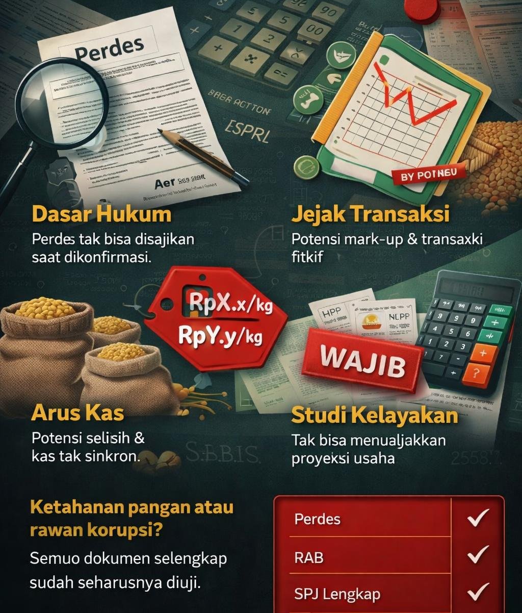 Kasus ini belum menyimpulkan pelanggaran. Tetapi dengan nilai anggaran besar, skema usaha yang rawan manipulasi harga, dan minimnya rincian saat dikonfirmasi, satu langkah menjadi tak terelakkan: buka Perdes, RAB, SPJ, data pemasok, bukti jual-beli, serta rekonsiliasi kas, dan uji di meja audit. Di sana, seluruh klaim akan berbicara dengan satu bahasa: data. (hambaAllah).