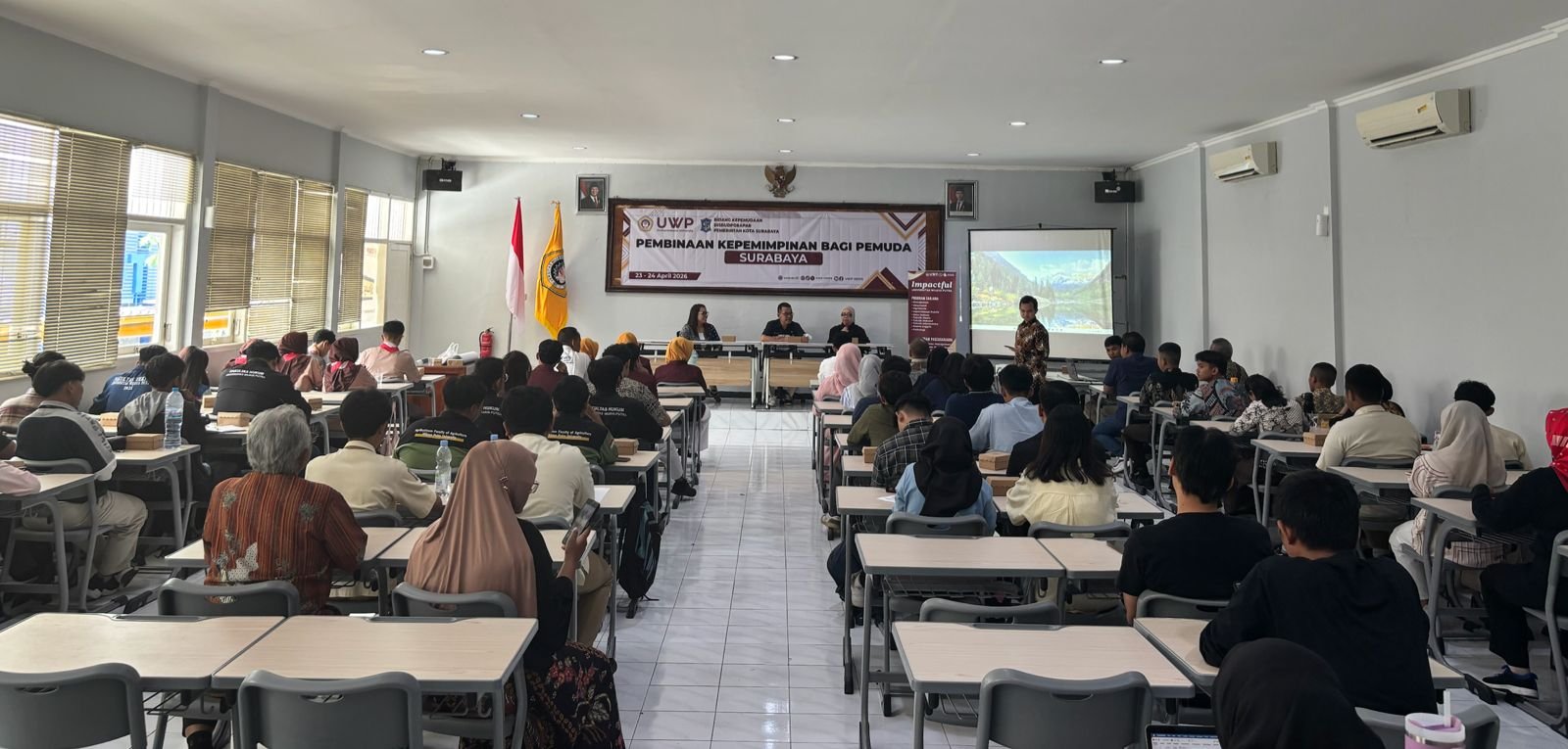 Sebanyak, Media Pojok Nasional – 60 peserta yang terdiri dari mahasiswa Universitas Wijaya Putra (UWP), siswa SMA dan SMK Wijaya Putra, siswa SMA dan SMK Wachid Hasyim, serta siswa SMAN 12 Surabaya mengikuti kegiatan Pembinaan Kepemimpinan bagi Pemuda yang diselenggarakan oleh Dinas Kebudayaan, Kepemudaan dan Olahraga serta Pariwisata (Disbudporapar) Kota Surabaya yang berlangsung selama dua hari, 23–24 April 2026, di Kampus UWP.