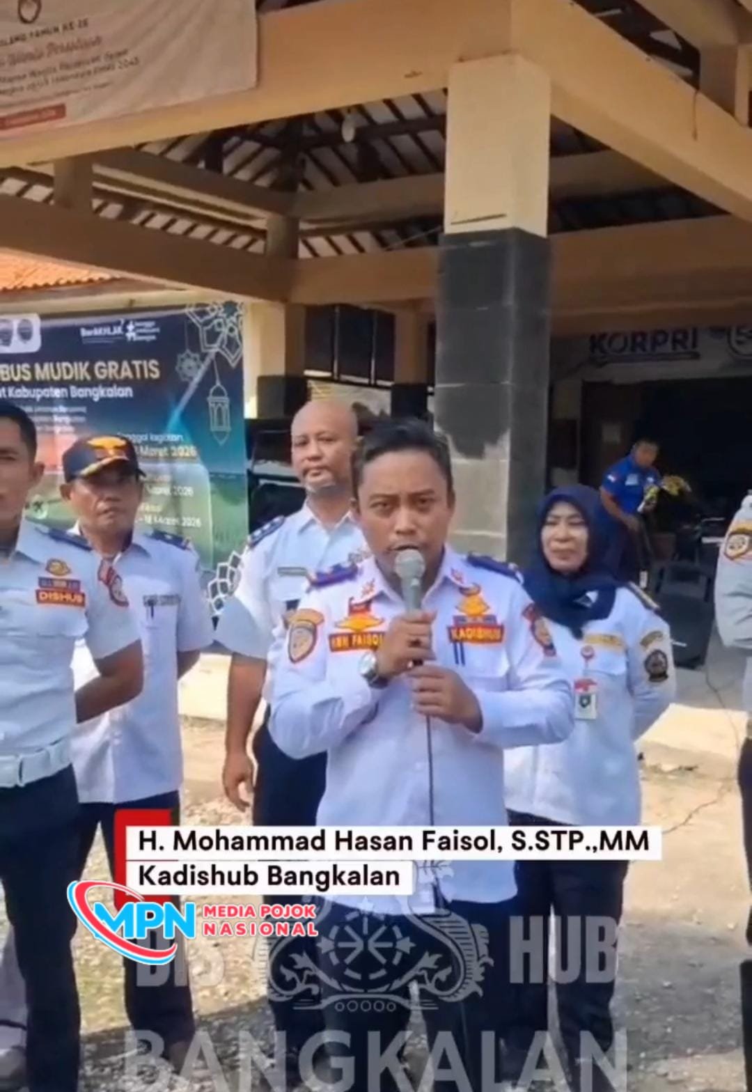 “Bismillahirrahmanirrahim. Assalamualaikum warahmatullahi wabarakatuh. Syukur Alhamdulillah pada hari ini, hari Selasa tanggal 17 Maret 2026, kami Pemerintah Kabupaten Bangkalan dalam hal ini Dinas Perhubungan Kabupaten Bangkalan akan melakukan pelaksanaan pelepasan program mudik bersama secara gratis,” ujarnya.