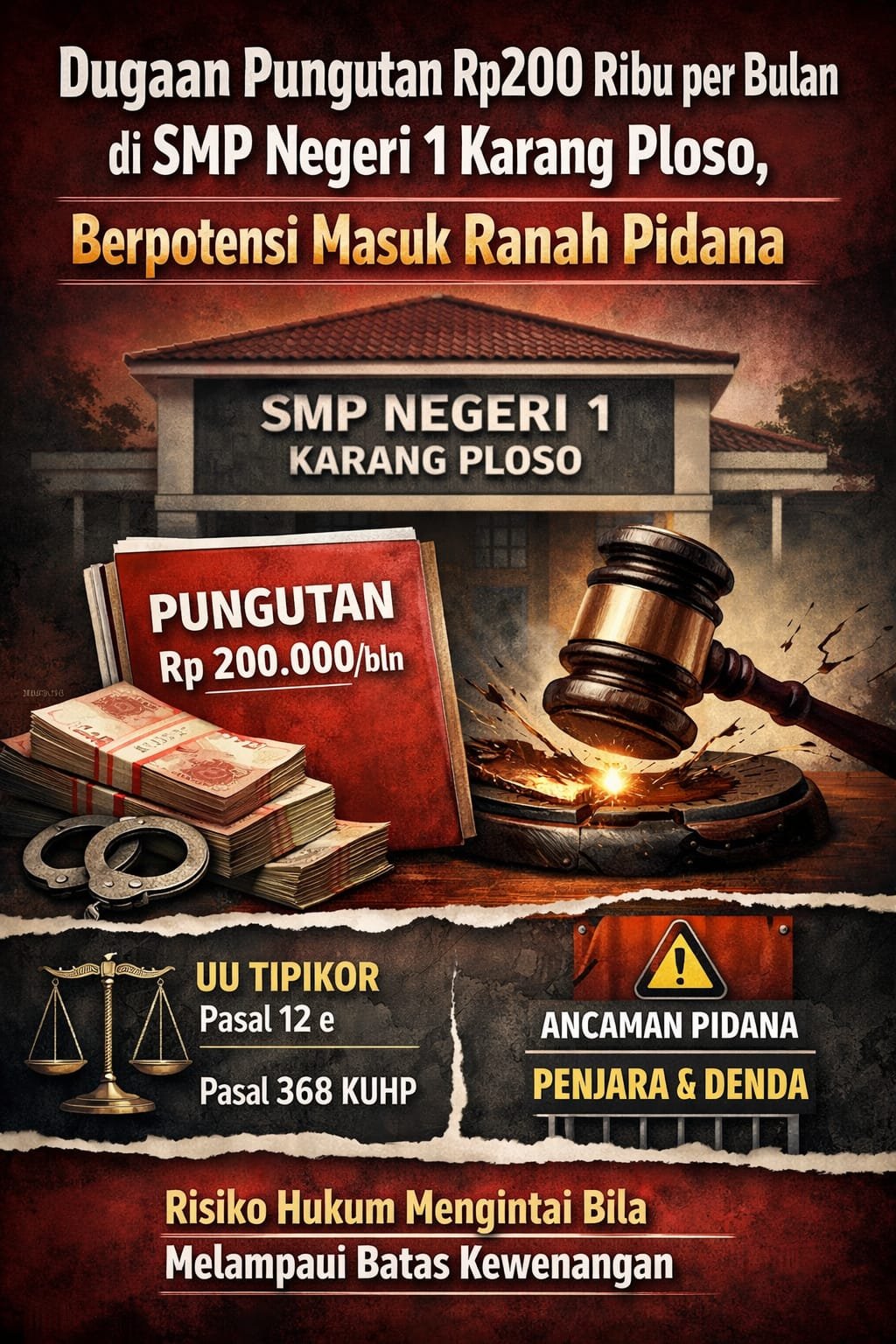Penetapan sumbangan komite sebesar Rp200.000 per bulan per siswa di SMP Negeri 1 Karang Ploso kini tidak lagi sekadar dipersoalkan secara administratif, tetapi mulai diuji dari perspektif hukum pidana. Sejumlah wali murid menyebut pembayaran dilakukan rutin dengan tenggat bulanan dan nominal seragam, sehingga secara faktual menyerupai kewajiban tetap.