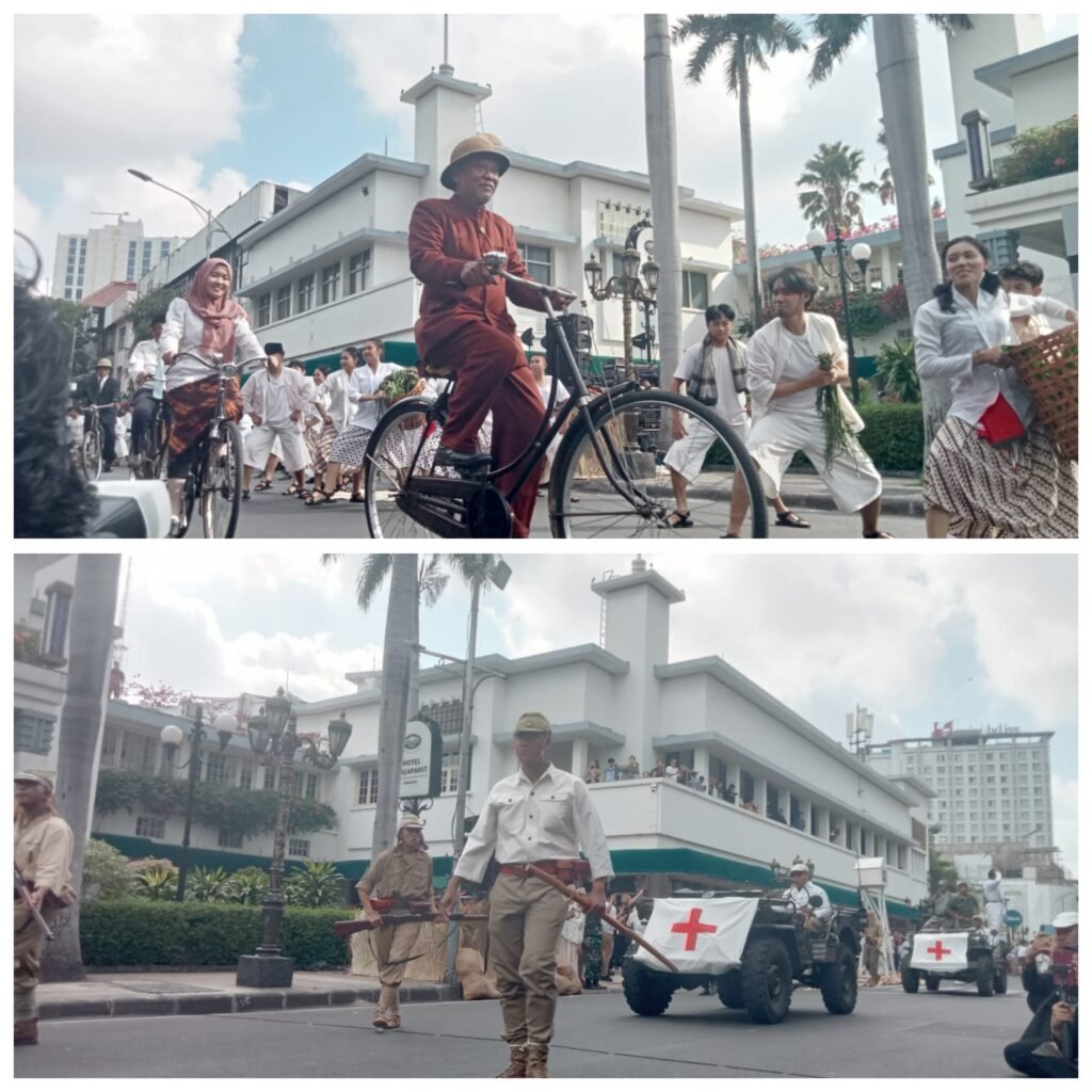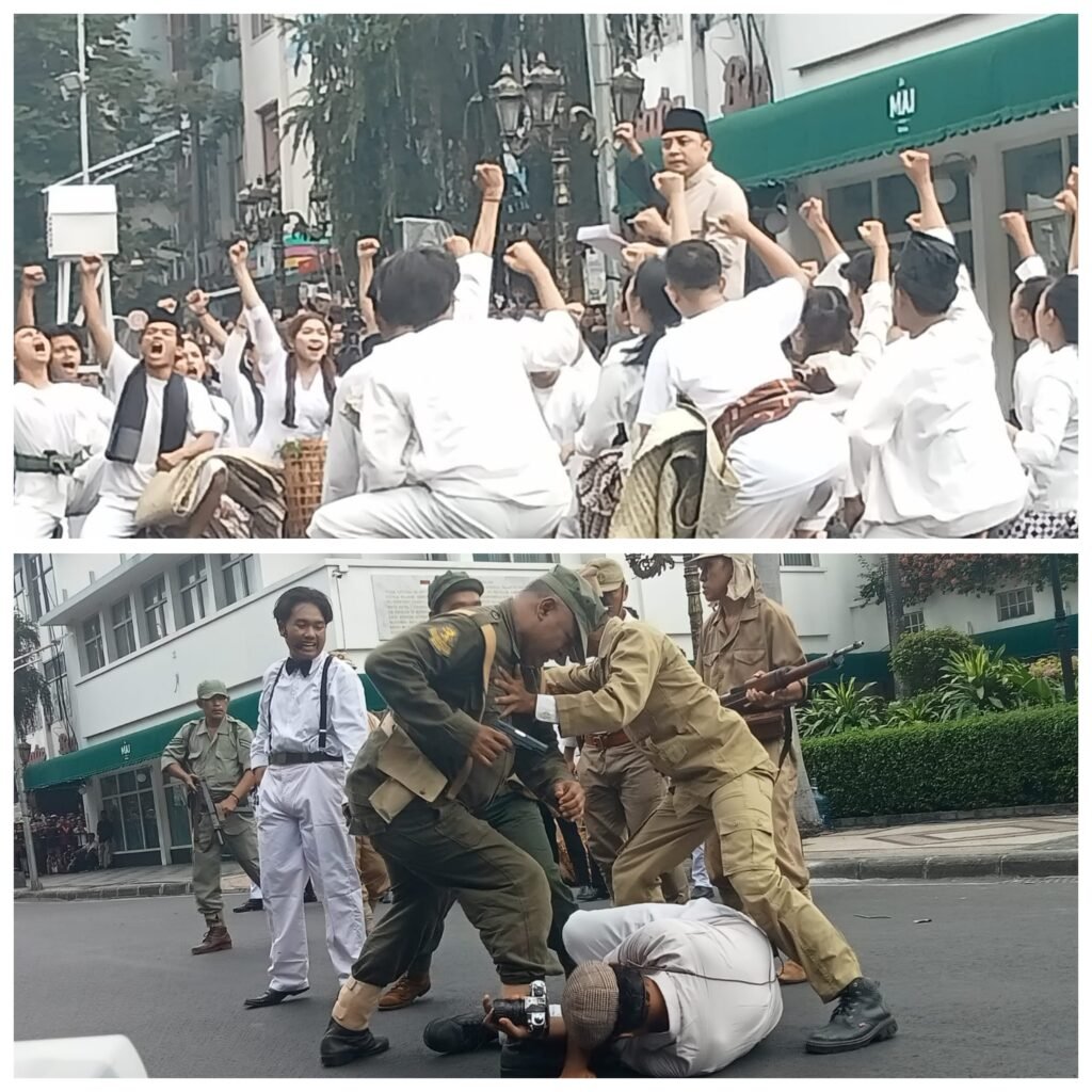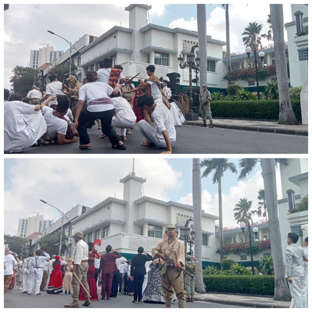 Surabaya, Media Pojok Nasional – Suasana Jalan Tunjungan, Surabaya, pada hari Minggu, 21 September 2025, berubah menjadi panggung sejarah yang megah. Ribuan warga Surabaya dan sekitarnya memadati kawasan depan Hotel Majapahit untuk menyaksikan drama kolosal yang menggambarkan peristiwa heroik perobekan bendera Belanda (Merah-Putih-Biru) menjadi Merah-Putih pada tahun 1945.