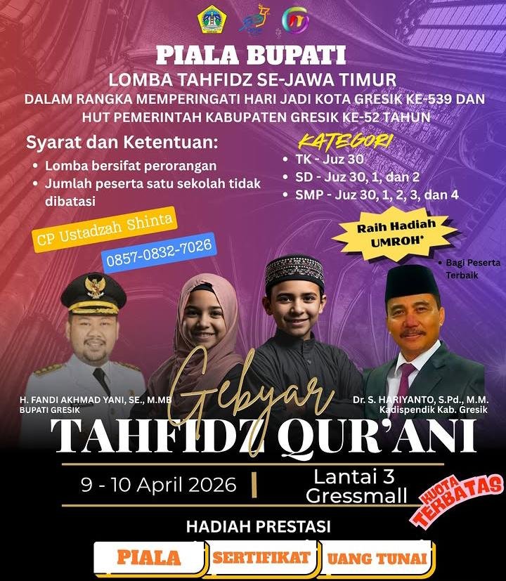 Dinas Pendidikan Kabupaten Gresik menyiapkan panggung kompetisi religius berskala regional melalui “Gebyar Tahfidz Qur’ani” yang akan digelar pada 9–10 April 2026 di lantai 3 Gressmall. Ajang ini tidak sekadar lomba hafalan, melainkan bagian dari strategi membangun ekosistem pendidikan berbasis karakter di tengah arus modernisasi.