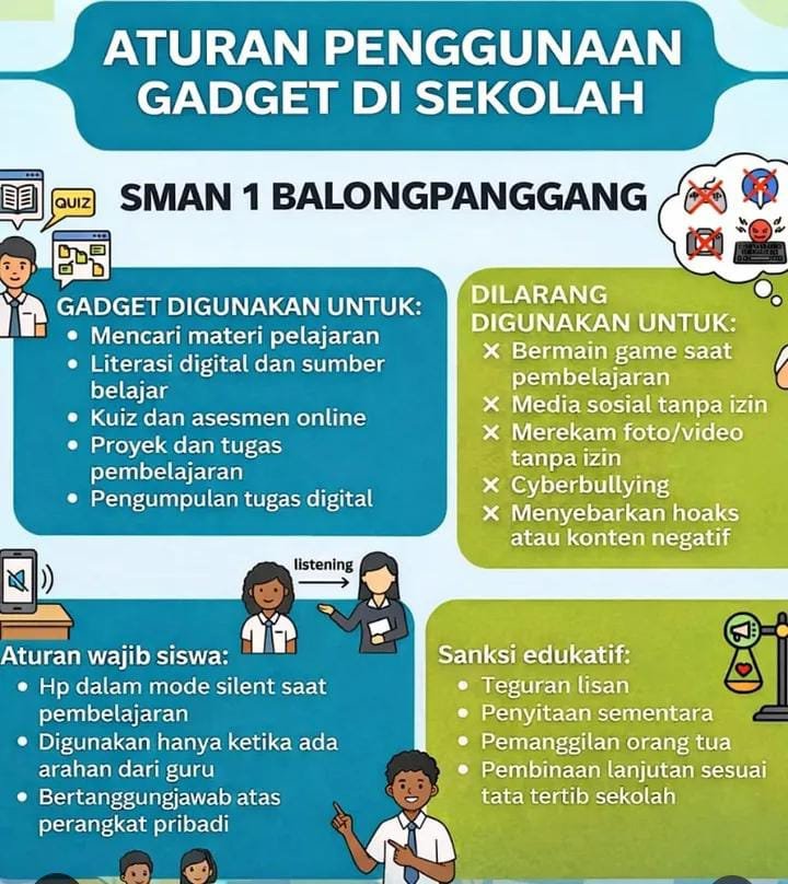 Melalui kebijakan ini, SMAN 1 Balongpanggang meneguhkan prinsip bahwa kecanggihan perangkat harus selaras dengan kecanggihan berpikir. Di era digital, menjadi pengguna yang cerdas dan beretika adalah fondasi utama dalam membangun masa depan yang berkualitas. (hambaAllah).