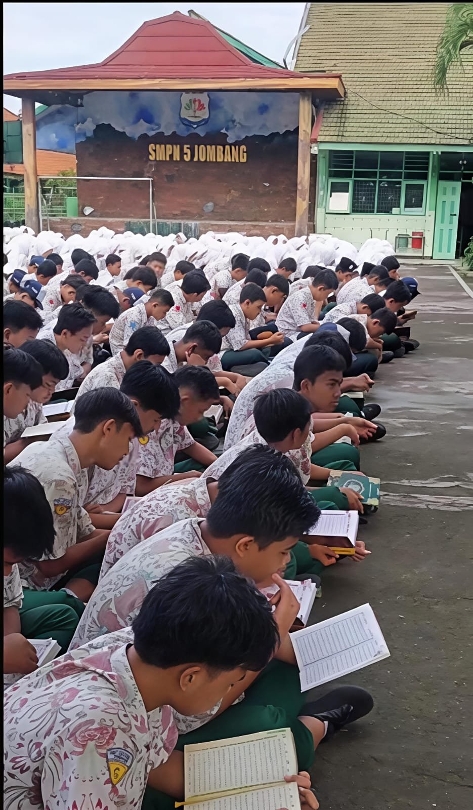 Nuansa religius begitu terasa di lingkungan SMPN 5 Jombang sepanjang bulan suci Ramadan 1447 H. Setiap pagi, sebelum kegiatan belajar mengajar dimulai, para siswa berkumpul di halaman sekolah untuk melantunkan ayat-ayat suci Al-Qur’an dalam kegiatan mengaji bersama.