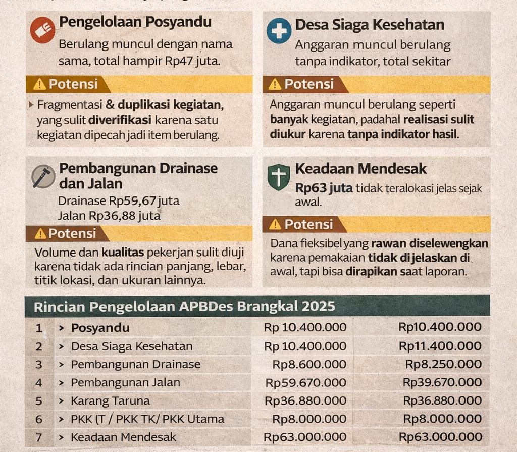 Anggaran Desa Tahun 2025 di Desa Brangkal sebesar Rp1.063.826.000 tersusun rapi secara administratif. Namun pembacaan rinci memperlihatkan sejumlah titik rawan yang dalam praktik audit berpotensi kuat menjadi pintu masuk kerugian negara dan indikasi korupsi.