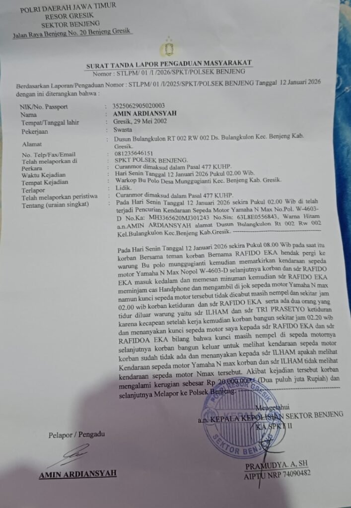 Korban, Amin Ardiansyah (23), warga Dusun Bulangkulon, Desa Bulangkulon, Kecamatan Benjeng, yang juga merupakan warga Persaudaraan Setia Hati Terate (PSHT), melaporkan kehilangan satu unit Yamaha N-Max warna hitam bernopol W 4603 D ke Polsek Benjeng pada Senin, 12 Januari 2026.