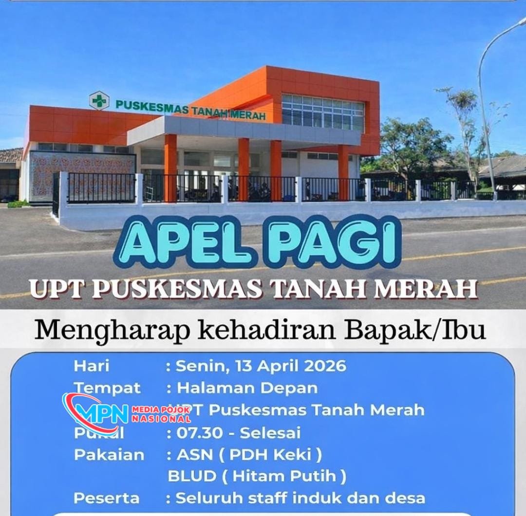 Apel pagi dijadwalkan berlangsung mulai pukul 07.30 WIB hingga selesai, bertempat di halaman depan UPT Puskesmas Tanah Merah. Kegiatan ini akan diikuti oleh seluruh staf, baik dari induk maupun jaringan desa, termasuk tenaga BLUD.