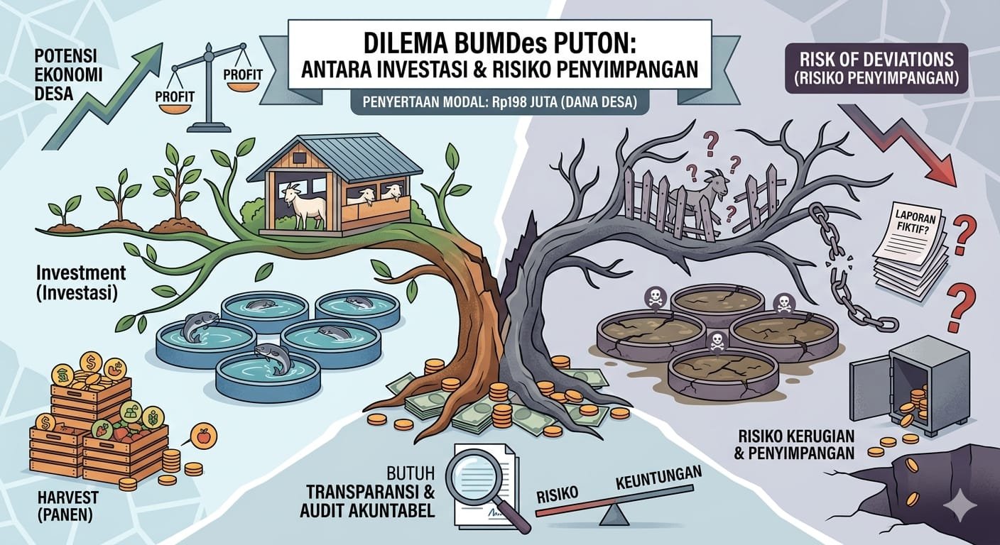 Penyertaan modal Desa Puton, Kecamatan Diwek, sebesar Rp198.295.000 dari Dana Desa 2025 mengundang tanda tanya. Dana itu, menurut Sekretaris Desa saat dikonfirmasi Kamis (16/4/2026), disalurkan ke BUMDes untuk usaha peternakan kambing dan budidaya lele.