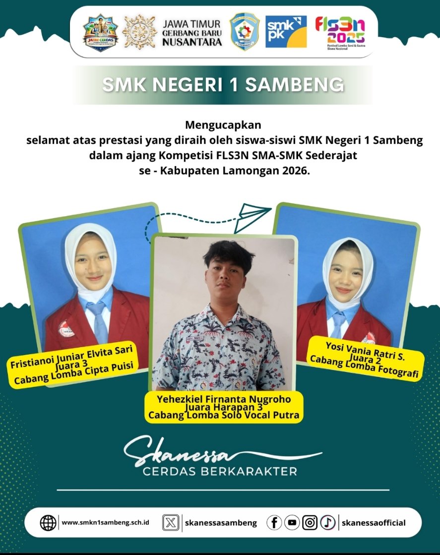 Lamongan, Media Pojok Nasional – Deretan prestasi kembali ditorehkan siswa-siswi SMK Negeri 1 Sambeng dalam ajang Festival dan Lomba Seni Siswa Nasional (FLS3N) tingkat SMA/SMK sederajat se-Kabupaten Lamongan 2026. Di tengah persingan ketat antar sekolah, tiga nama berhasil menembus podium, menegaskan konsistensi sekolah ini dalam membina talenta seni.