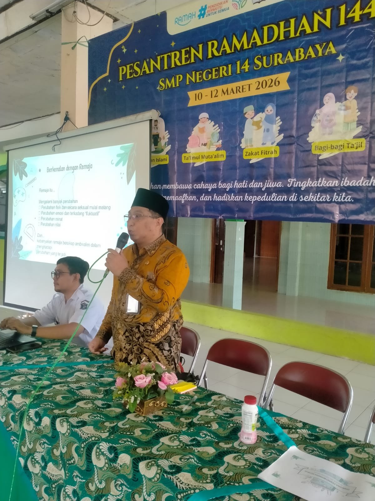 Surabaya, Media Pojok Nasional – Kantor Urusan Agama (KUA) Kecamatan Pakal menggelar sosialisasi penting bertema “Dinamika Perkembangan Remaja” di Aula SMP Negeri 14 Surabaya, yang terletak di Jalan Jurang Kuping, Kelurahan Benowo, Kecamatan Pakal, Surabaya, pada Senin (16/3/2026). Acara ini dipimpin langsung oleh Kepala KUA Pakal, KH Moenawar Kholil S.Ag, dan dihadiri oleh staf KUA Pakal bagian penyuluh Ustadz Soemiadji S.Ag, Kepala Sekolah SMP Negeri 14 Surabaya, serta para guru dan murid sekolah tersebut.