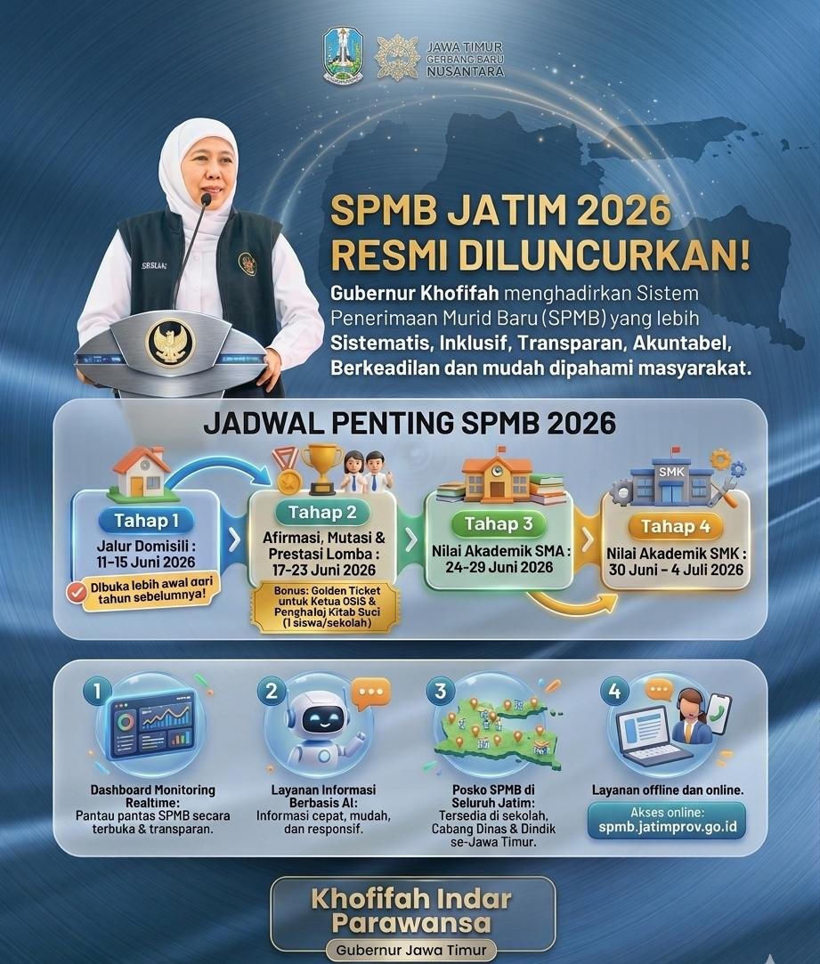 Khofifah Indar Parawansa resmi meluncurkan Sistem Penerimaan Murid Baru (SPMB) Jawa Timur 2026. Pemerintah provinsi menandai perubahan desain seleksi yang diklaim lebih sistematis, inklusif, transparan, dan akuntabel, sekaligus berupaya menutup celah praktik yang selama ini kerap dipersoalkan publik.