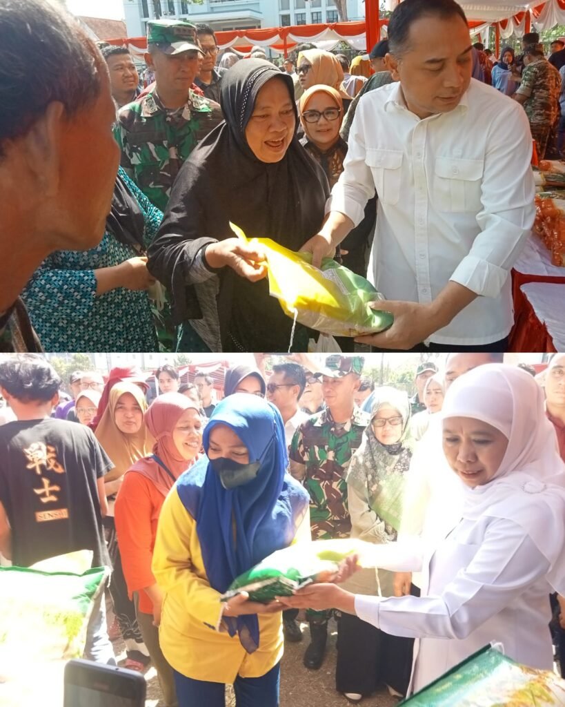 Dalam sesi turun lapangan (kunjungan ke pedagang penjual beras murah) Khofifah serta Eri Cahyadi, sempat tanya jawab dan memberikan beras murah gratis ke penggunjung.