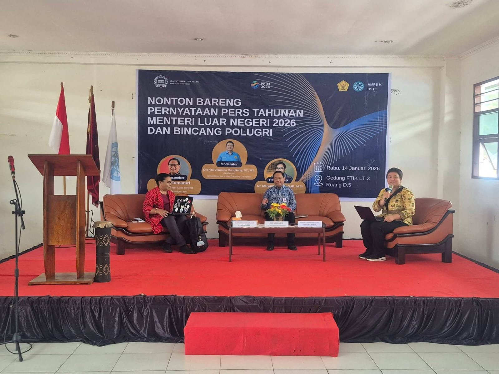 Kegiatan PPTM 2026 di USTJ dilanjutkan dengan Bincang Politik Luar Negeri, menghadirkan Narasumber Bapak Acep Somantri selaku Staf Ahli Menteri Luar Negeri Bidang Manajemen, bertindak sebagai penanggap Dr. Melyana R. Pugu, S.IP, M.Si (Akademisi Universitas Cenderawasih), dipandu oleh Evanita V. Manullang, MT (Akademisi USTJ) selaku Moderator. Peserta kegiatan didominasi oleh mahasiswa/i USTJ lintas program studi.