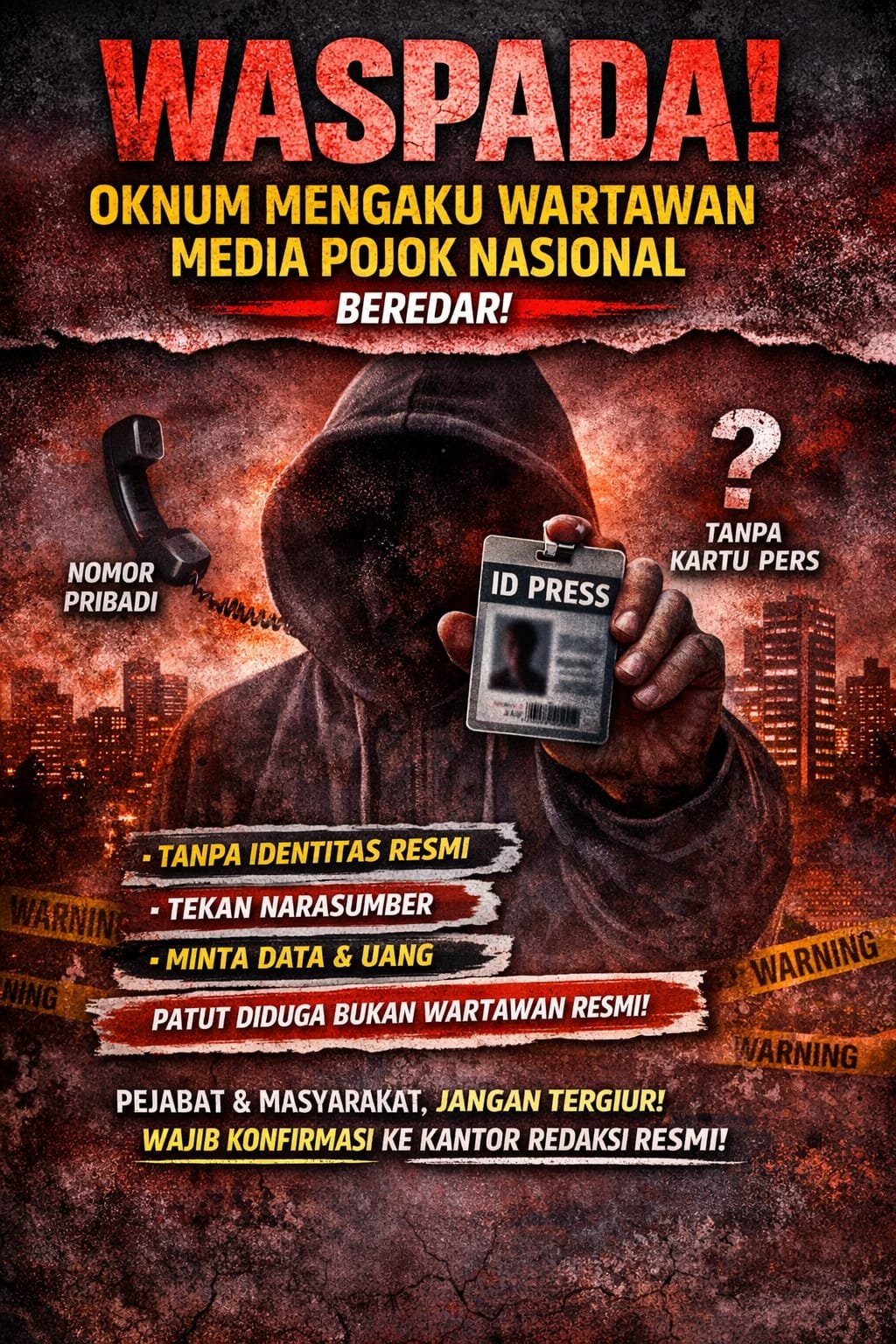 Pejabat dan masyarakat diimbau waspada terhadap oknum yang mengaku sebagai wartawan Media Pojok Nasional namun tidak bisa menunjukkan identitas pers resmi. Oknum ini kerap menghubungi narasumber langsung, meminta informasi atau klarifikasi, bahkan memberi tekanan, tanpa kartu pers, surat tugas, atau identitas redaksi yang dapat diverifikasi. Nomor yang digunakan biasanya nomor pribadi tanpa kejelasan legalitas.